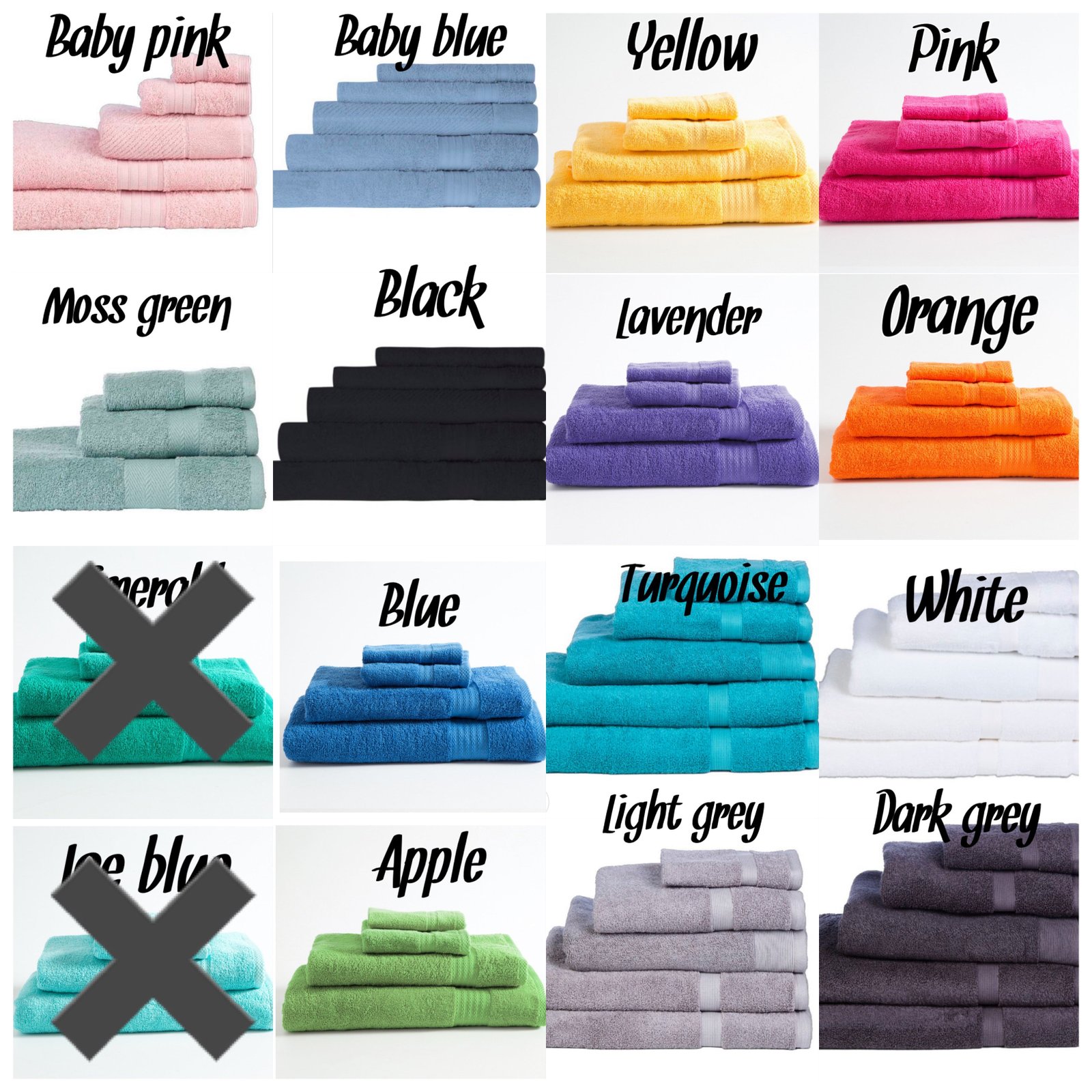 Towels can be made in any colour, if  your choice can’t be sourced we will email you to discuss options but feel free to contact us first