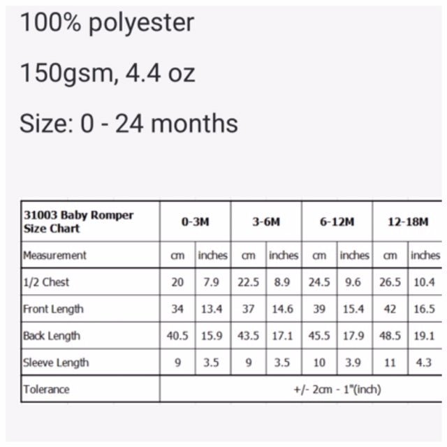 Sublimation printed designs on polyester, onesies are size 1 and below and are quite a generous make, tee’s go up by 2 from size 2, please refer to size chart for correct sizing measurements
