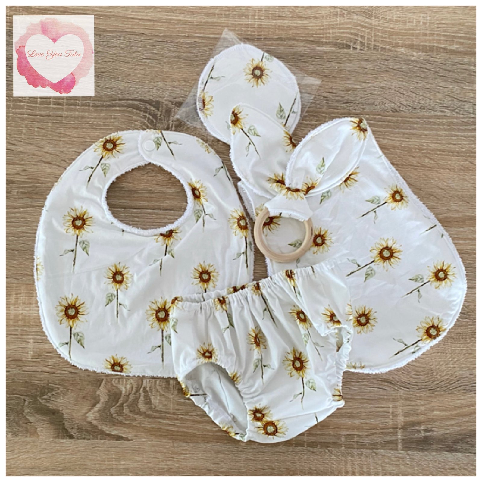 Bib, burp cloth and bunny ear teether with soft terry towel backing & 100% cotton front
